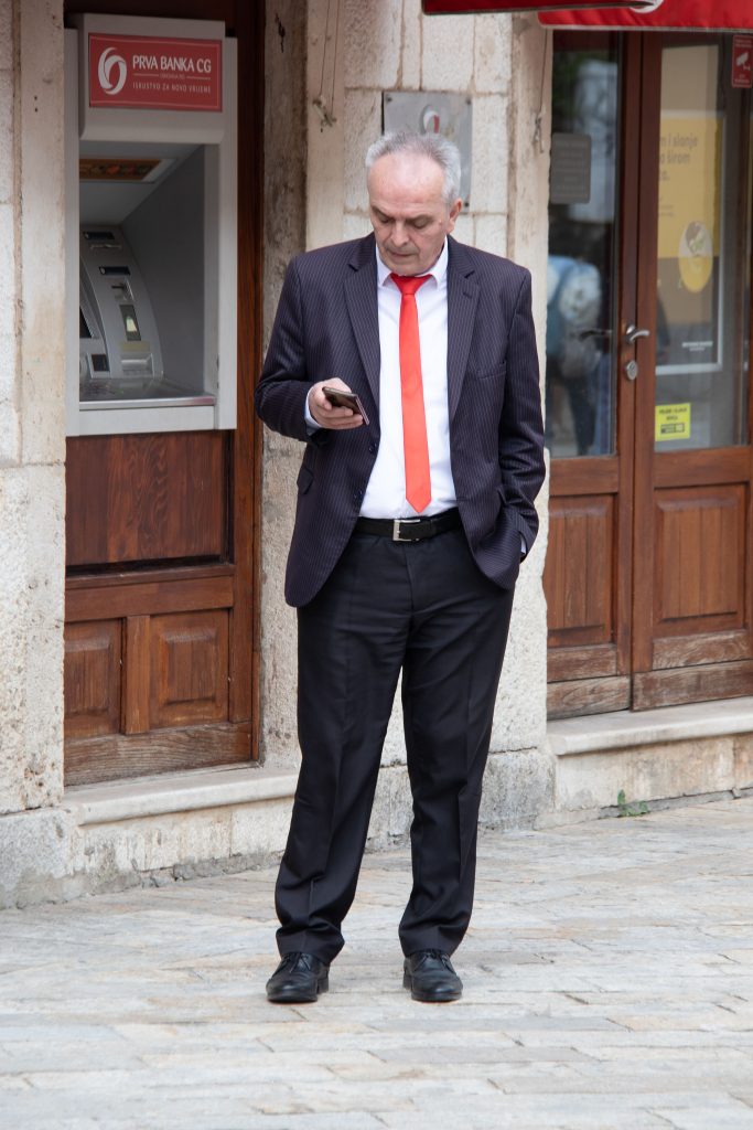 Every morning, he comes out of the bank and looks at his phone