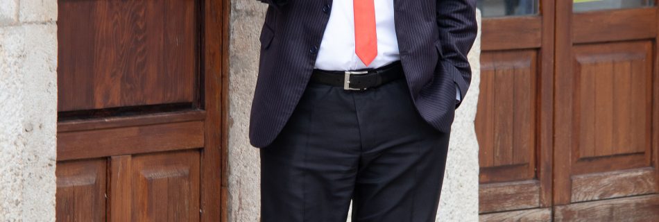 Every morning, he comes out of the bank and looks at his phone